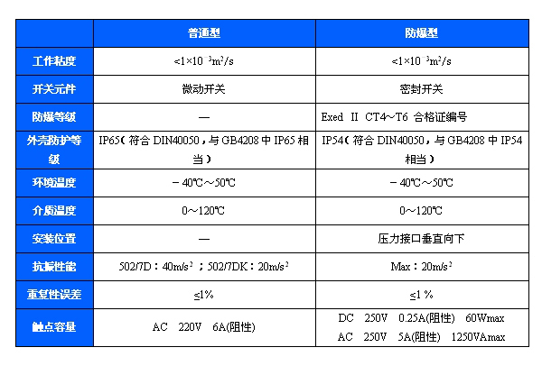 502/7D防爆壓力開關(guān)可用于真空。有特殊要求的,可另行設(shè)計調(diào)節(jié)范圍-0.1~6.3MPa。